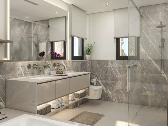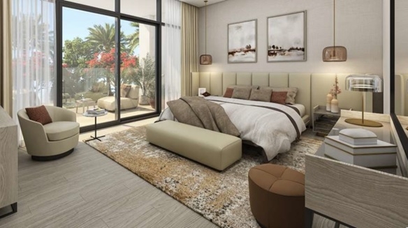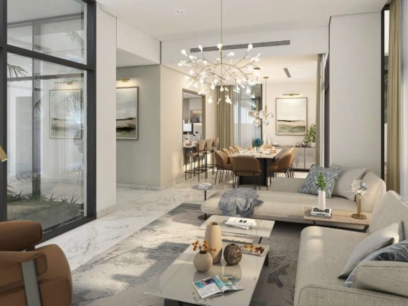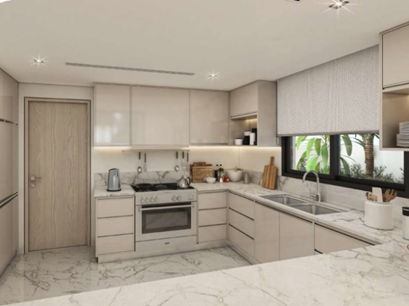The four-bedroom homes feature a covered garage, an elevated large shaded balcony that overlooks the rear garden, and a swimming pool. The entrance foyer leads directly into the living area, benefitting from the natural light coming in through the floor-to-ceiling glazing and offering a view of the rear garden. On the ground floor are a closed kitchen, ample storage space, a maid’s room, and a guest bedroom with a bathroom. The upper floor has a family room with a pantry and study while all bedrooms have built-in wardrobes and are accompanied by en-suite bathrooms.
